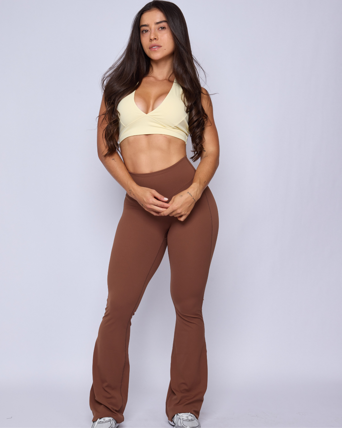 Ideal como ropa deportiva para gimnasio, yoga, pilates o entrenamientos funcionales, y lo suficientemente versátil para llevar en tus actividades diarias. Su pantalón flare estiliza las piernas y aporta un toque elegante, mientras que el top deportivo y la t-shirt opcional te permiten crear looks adaptados a tu estilo.